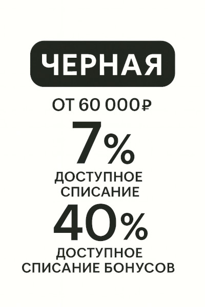 - Черный - карта с кешбеком бонусными баллами 7% от всей суммы покупки. Выдается при сумме всех покупок за 6 месяца от 60000р.