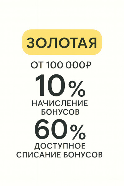 - Золотой - карта с кешбеком бонусными баллами 10% от всей суммы покупки. Выдается при сумме всех покупок за 6 месяца от 100000р.