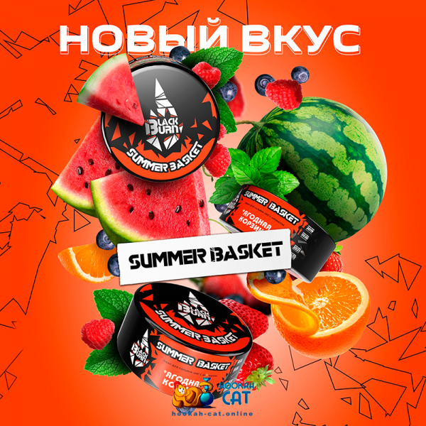 Табак для кальяна BlackBurn Summer Basket (БлэкБерн Ягодная Корзина) 100г Акцизный - спелый сахарный арбуз в сочетании со сладким ягодным смузи из малины, она преобладает и апельсина.
