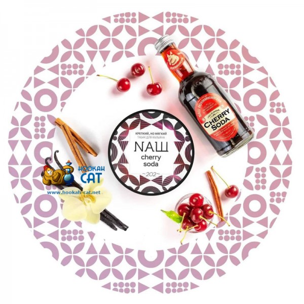 Табак для кальяна NАШ CHERRY SODA (НАШ Черри Сода) 100г Акцизный - вкус из миксологической линейки - насыщенный, но не чрезмерно, вкус вишневой содовой с нотами корицы и ванили. Чем-то напоминает напиток Dr. Pepper просто с корицей. Вкусно и сочно.