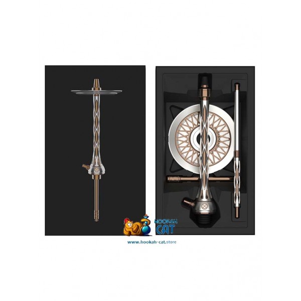 Помимо его особенных отличий, так же стоит отметить, что кальян довольно высокий (высота с колбой примерно 60см), а погружная шахта имеет так же бронзовый окрас. Накладка, как и основание покрыты анодированным алюминием платинового цвета. Мундштук стилизован под шахту и довольно удобно лежит в руке. На блюдце, кстати, имеется дополнительная сеточка, которая способствует не такому быстрому потуханию угля, если скинуть на нее лишний кубик.