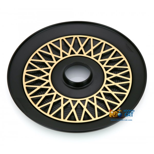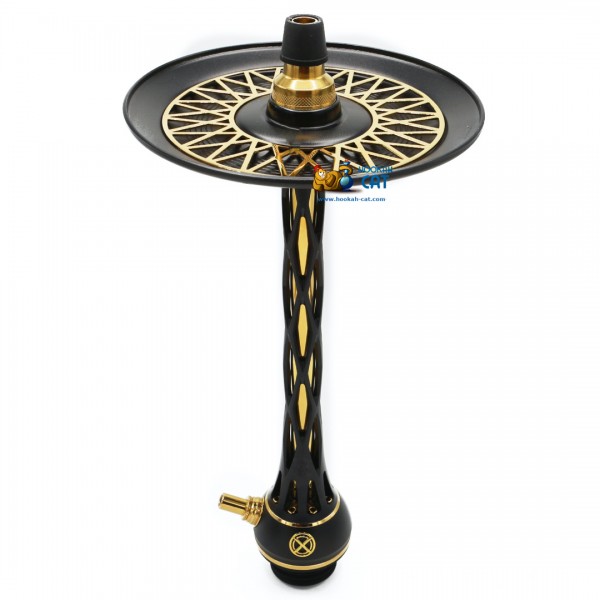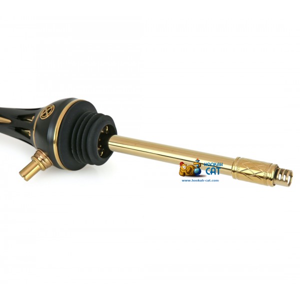 Помимо его особенных отличий, так же стоит отметить, что кальян довольно высокий (высота с колбой примерно 60см), а погружная шахта имеет так же золотой окрас. Накладка, как и основание покрыты анодированным алюминием черного цвета. Мундштук стилизован под шахту и довольно удобно лежит в руке. На блюдце, кстати, имеется дополнительная сеточка, которая способствует не такому быстрому потуханию угля, если скинуть на нее лишний кубик.